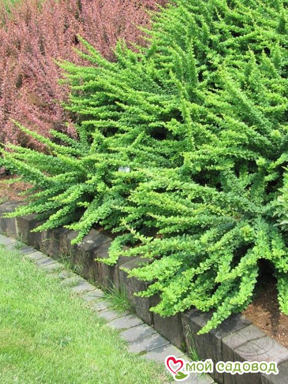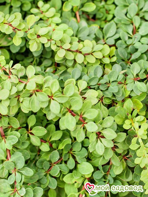 Барбарис тунберга Грин Карпет (Berberis thunbergii Green Carpet) — небольшой кустарник, высотой до 1 м, и диаметром кроны 1,5 м. Крона подушковидная, раскидистой, с большими годовыми приростами и листьями, летом насыщенно светло-зелеными, а осенью оранжево-желтыми, плотная, с поникающими раскидистыми побегами. Кустарник широкий, расплющенный. Кора коричнево-желтая. Шипы трехраздельные. Цветет в конце мая — начале июня. Цветки одиночные или собраны в соцветия по несколько штук (2-5), внутри желтые снаружи красные, расположены по всему побегу. Плоды продолговатые, блестящие, многочисленные, розовые или красные, созревают в сентябре. Украшают куст после опадания листвы, иногда сохраняясь на нем всю зиму. Светолюбив, но выносит полутень. Засухо- и жароустойчив. К плодородию почв нетребователен. Любит щелочные почвы. Не выносит застойного увлажнения. Хорошо переносит городские условия. Устойчив к болезням и вредителям.