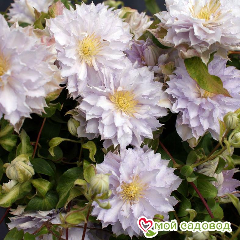 Клематис ‘Дансин Кинг’ — крупноцветковый раннецветущий сорт. Цветки всегда махровые, шаровидной формы, нежно-сиреневые, позже приобретают более раскрытую махровую форму и меняет цвет на бледно фиолетовый. Тычинки желтые. Диаметр цветка от 5 до 12 см. Цветет на побегах прошлого года махровыми цветками с мая по конец июня, повторное цветение на побегах этого года махровыми цветками с июля по сентябрь. Хорошо растет на солнечных и защищённых от ветра местах. Вполне устойчив к садовым вредителям и болезням. Особенно хорош для выращивания у ограждений, беседок, пергол, решёток. Прекрасно подходит для выращивания в больших контейнерах на террасах и балконах. В нашем интернет-магазине вы сможете купить Клематис Так же возможно вас заинтересуют Клематис Дансинг квин и Клематис Дансинг Смайл .